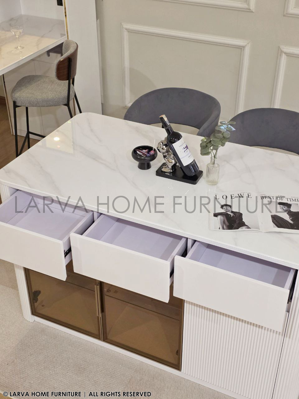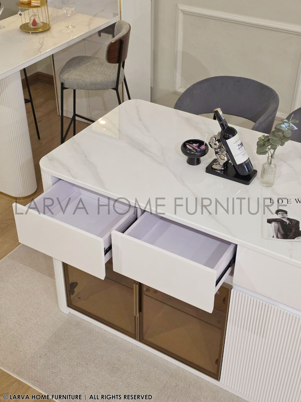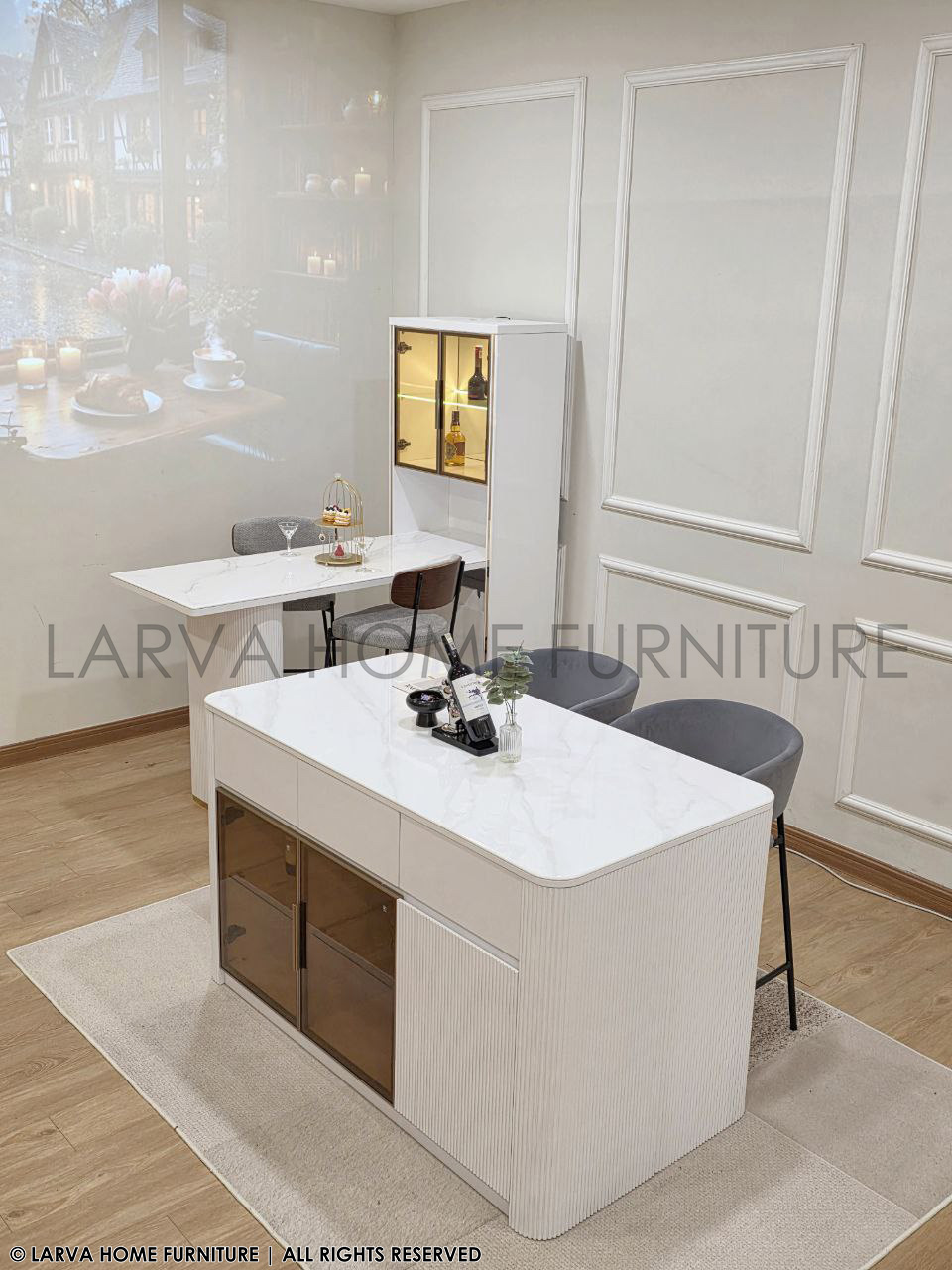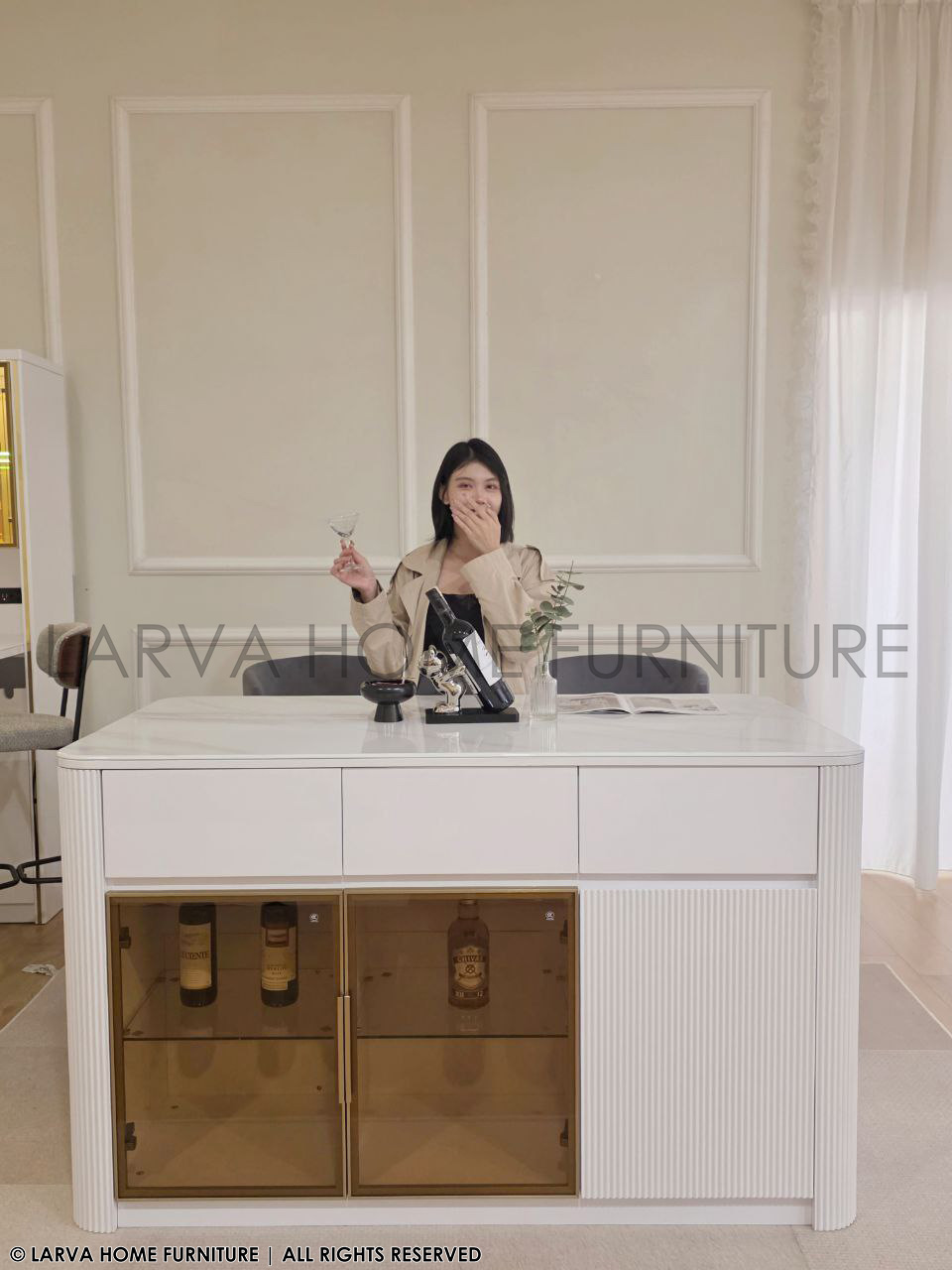 Redefine your dining and kitchen experience with this multifunctional Chris Island Table. Designed in a clean white finish complemented by a marble-patterned countertop, it creates a bright and polished focal point in your space. The warm-toned glass doors gently showcase your wine bottles, glassware, or decorative pieces, adding an instant touch of luxury.