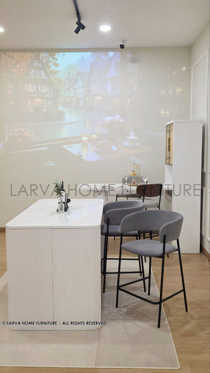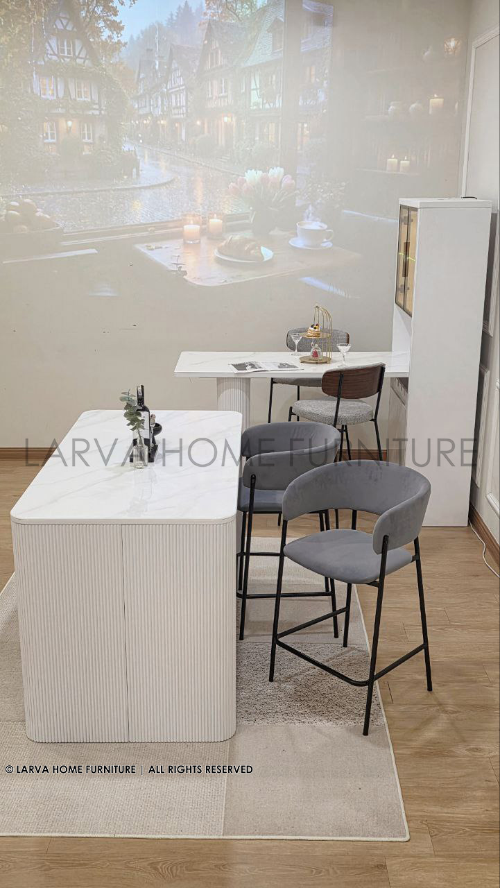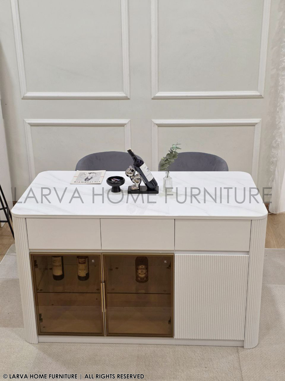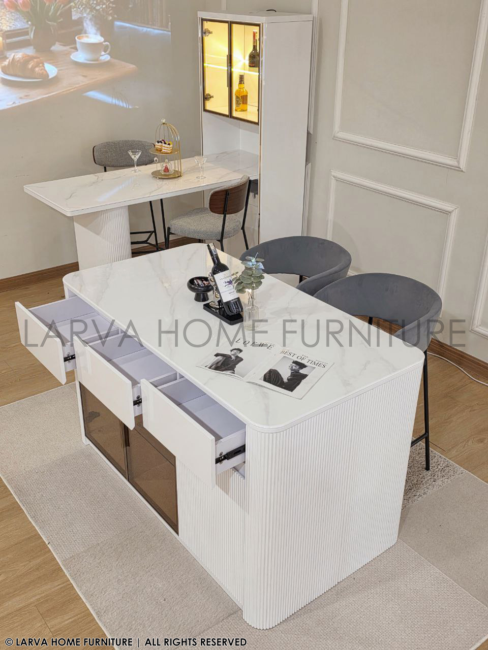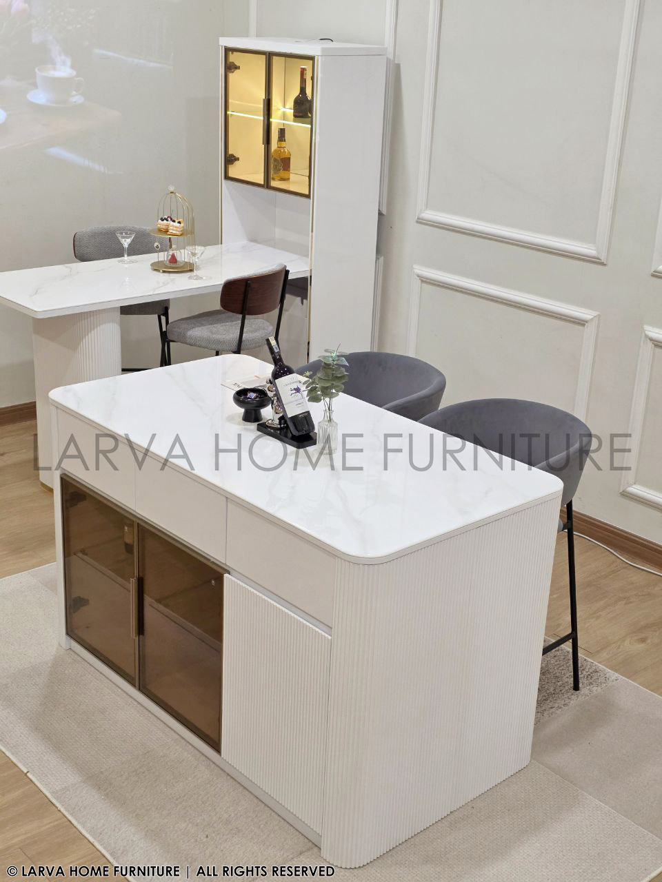 Redefine your dining and kitchen experience with this multifunctional Chris Island Table. Designed in a clean white finish complemented by a marble-patterned countertop, it creates a bright and polished focal point in your space. The warm-toned glass doors gently showcase your wine bottles, glassware, or decorative pieces, adding an instant touch of luxury.