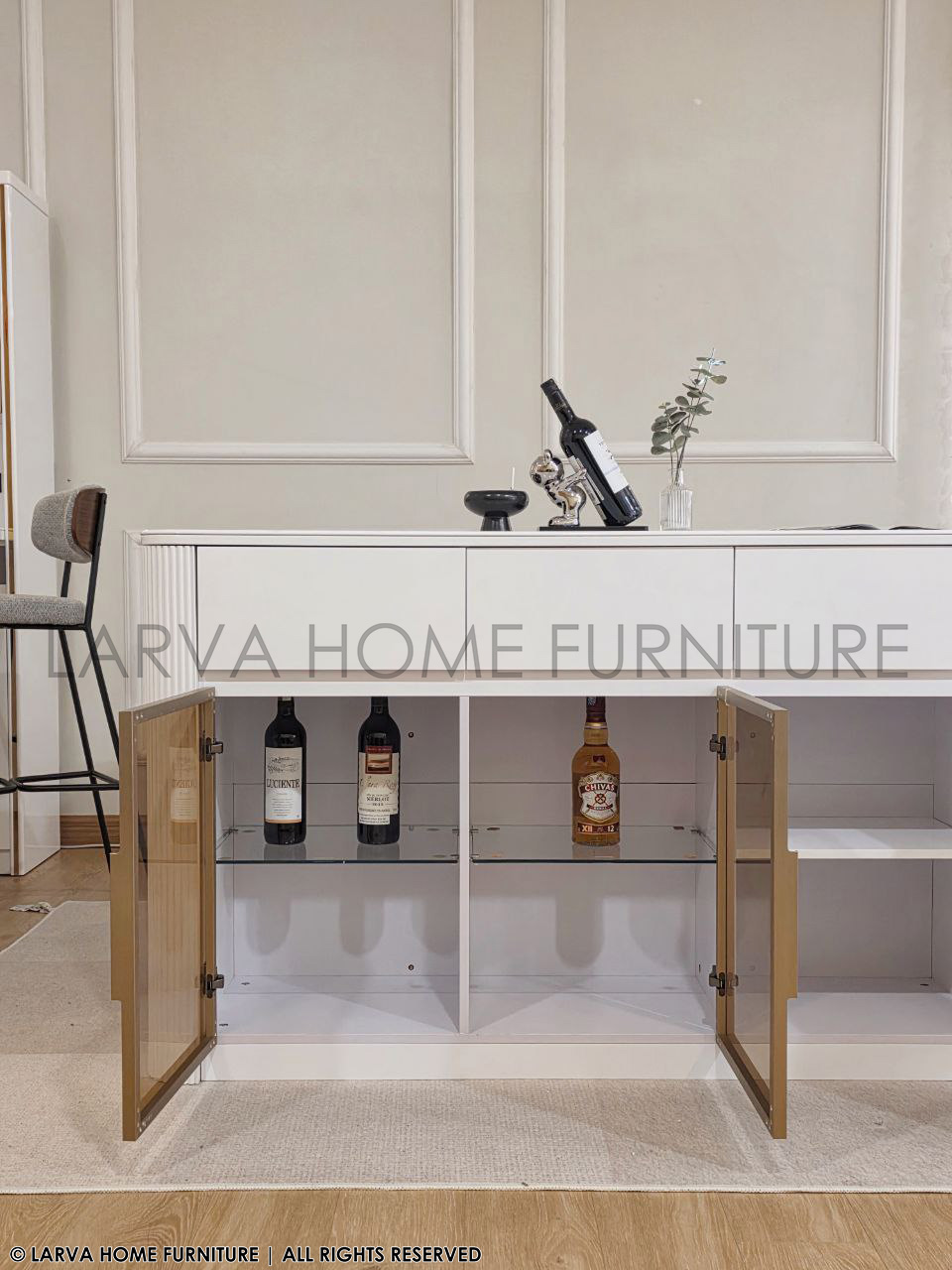 The spacious countertop serves as an ideal station for meal prep, coffee making, or entertaining guests. Multiple drawers and compartments provide abundant storage to keep everything neatly organized. Whether used as a kitchen island, sideboard, coffee counter, or wine display unit, this cabinet blends practicality with modern elegance, making it an essential centerpiece for any contemporary home.