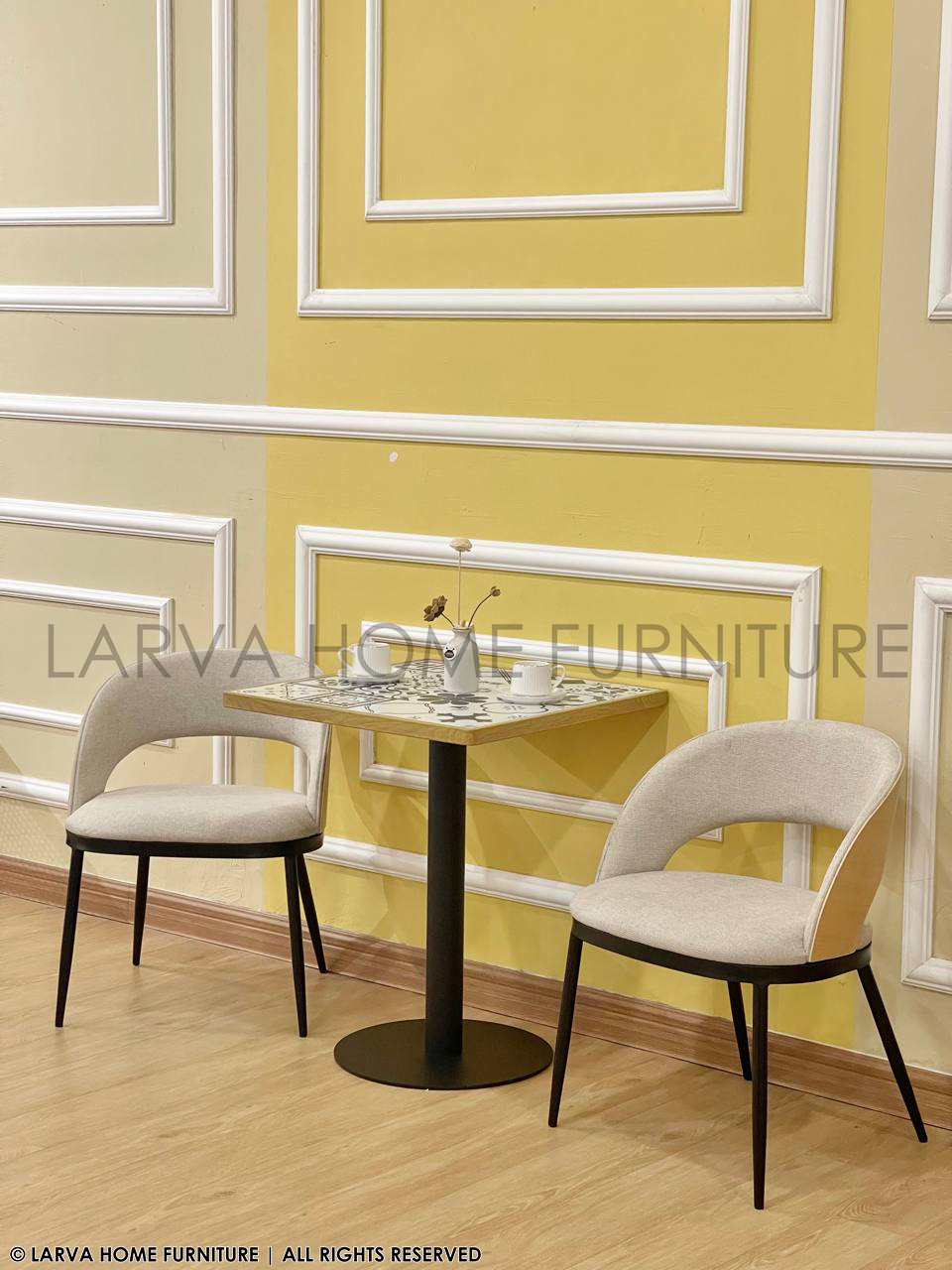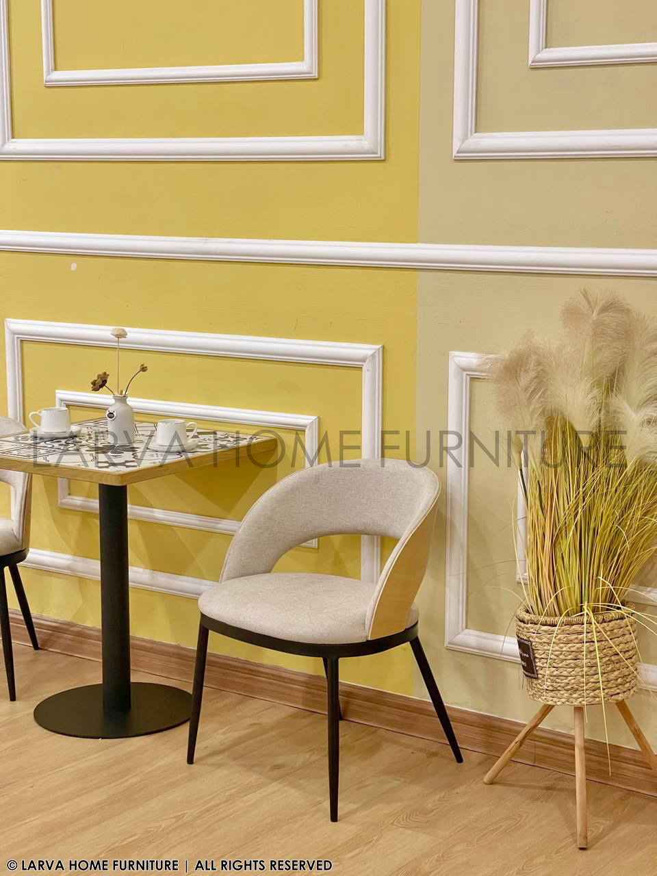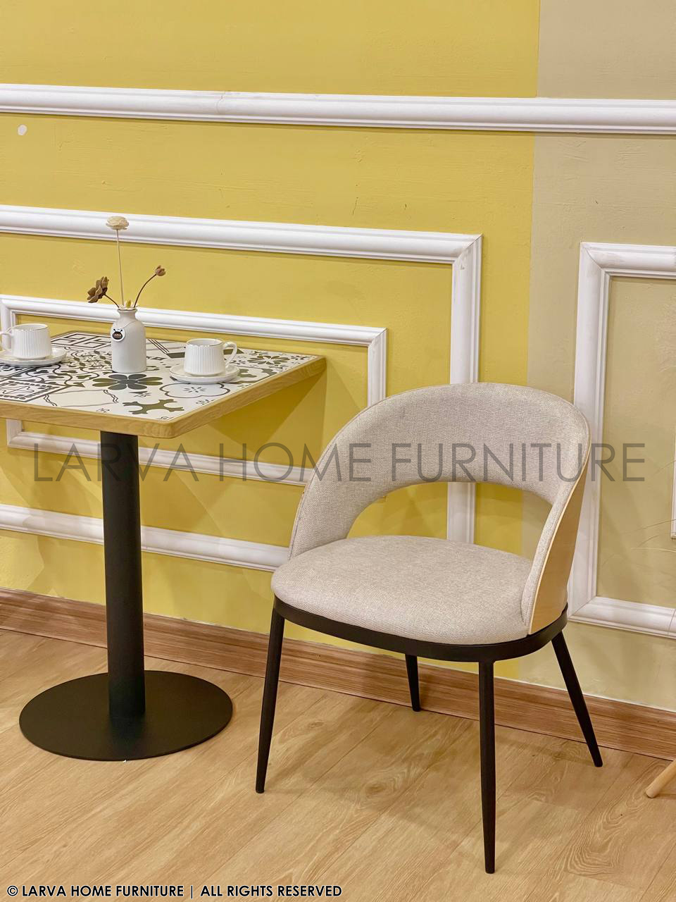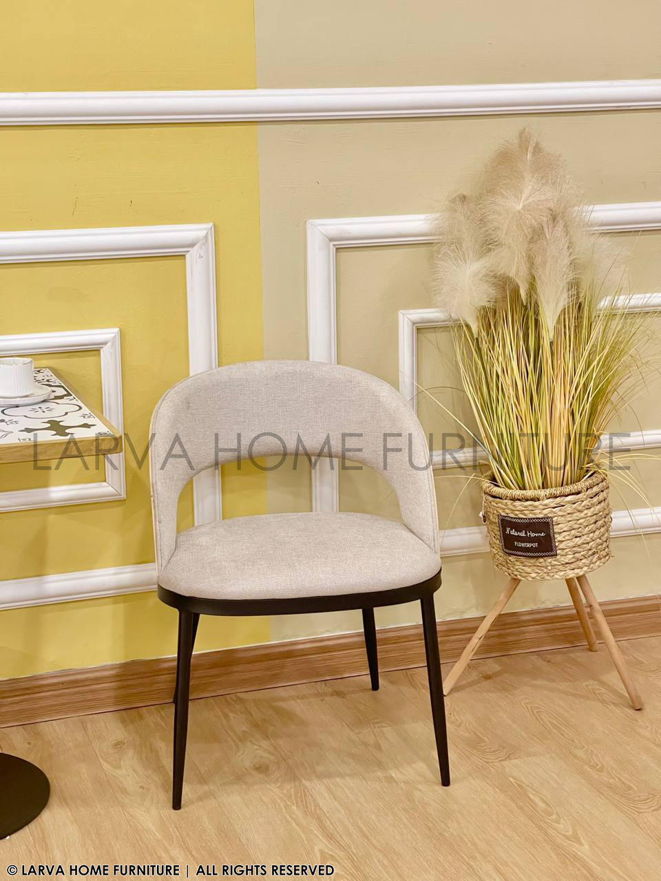 This Cailyn Designer Chair showcases a sculpted, contemporary form with a blend of fabric and natural wood accents. The curved backrest provides supportive comfort while adding visual sophistication. Its modern profile works well in dining rooms, reception areas, or stylish home corners. The wooden detail brings warmth to the overall design. Sturdy metal legs ensure stability and durability. A refined and versatile statement chair.